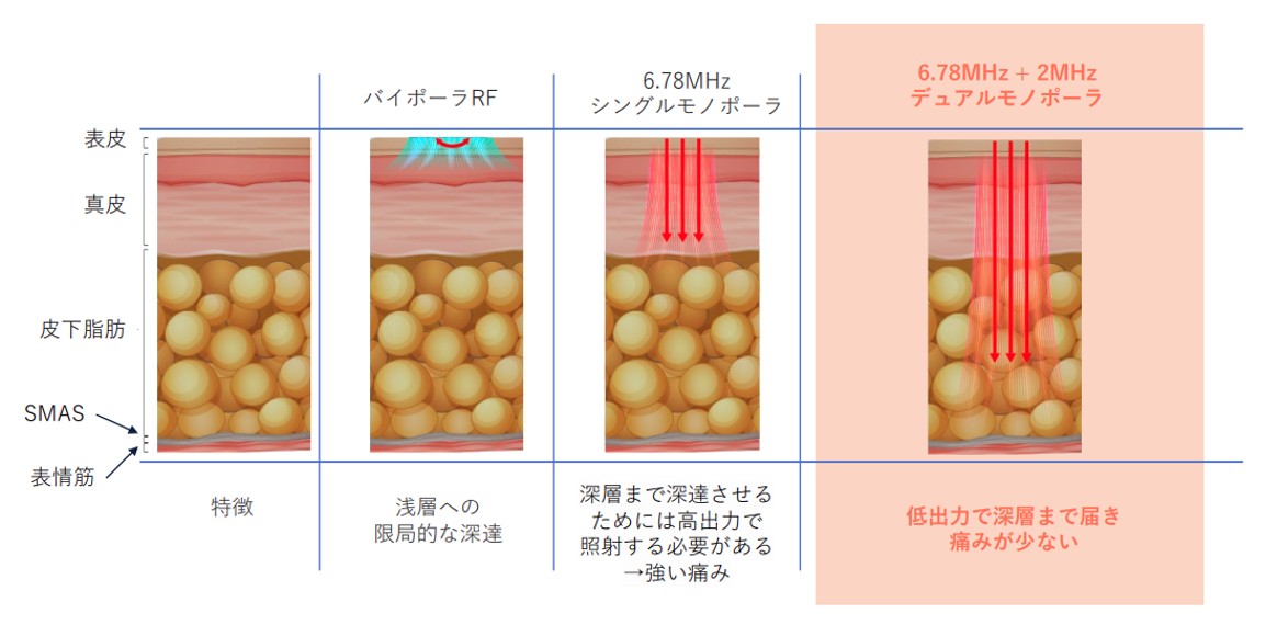 たとえば6.78MHz単独周波数を用いたサーマジェンやボルニューマ、オリジオなどは、真皮層や皮下脂肪層の加熱には一定の効果があるものの、XERFはそれらに加えて2MHzを同時照射可能です。これにより、真皮深層や、皮下組織層まで効率的にアプローチできるのが特徴です。